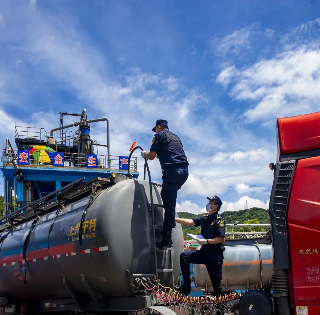 海關(guān)關(guān)員在查驗(yàn)出口危險(xiǎn)化學(xué)品及包裝