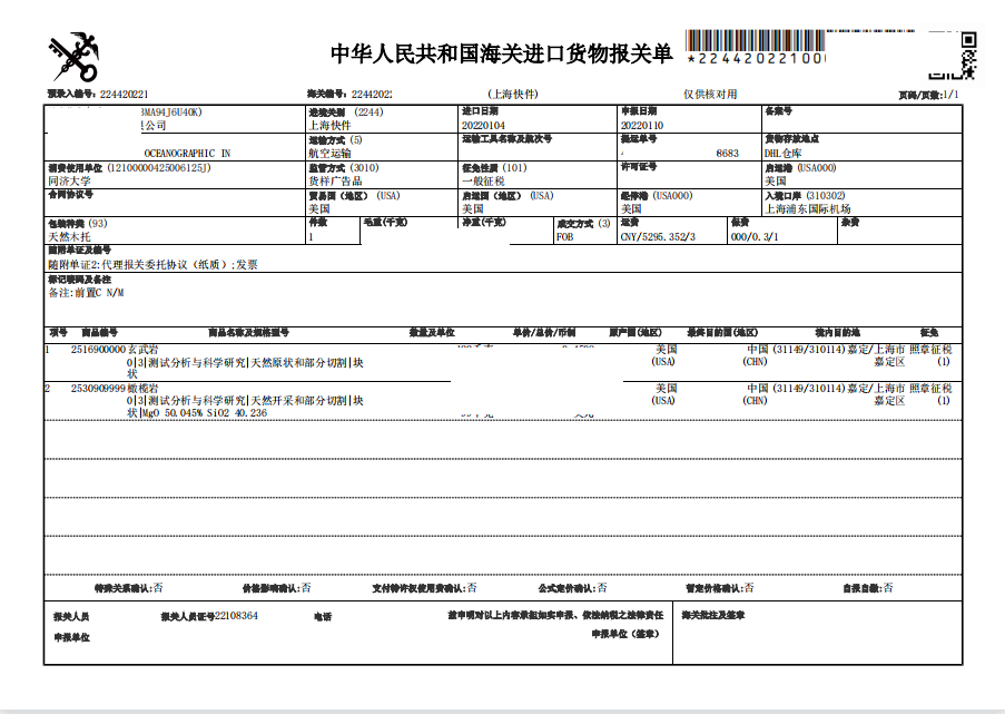 從美國進口一個托盤礦石,貨物是客戶通過美國同事采集樣品,然后空運發(fā)到上海,收貨地址是某大學醫(yī)學研究室。由于收貨人是該學院的醫(yī)學教授,所以對于貨物進口的流程不是很熟悉。在確認好價格后讓我們直接于負責空運的DSV聯(lián)系,DSV最初只讓我們提供申報抬頭,后在貨物即將到港才通知我們,需要我們提供液氮罐進口清關服務。因為貨物還有兩天就要到達,客戶本人又在美國,有著近12個小時的時差。所以在還沒有得到客戶的確認情況下,為了不耽誤清關時間,我便當即開始準備資料。后在晚上跟客戶說明情況后,客戶決定交由我們清關,并且將所做的清關資料發(fā)給客戶審核。